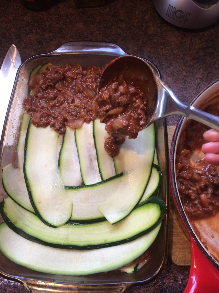 6. One more layer of zucchini slices and bolognese sauce.