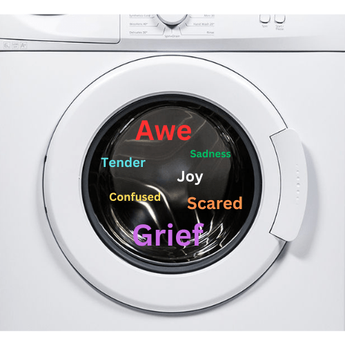 The thing that struck me the most during these last weeks, is how I experienced my feelings as a washing machine… one that is doing its cycle and tumbles around. Each moment a different piece of clothing shows itself through the door window. You get the picture?